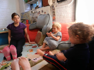 We revisited our individual collages using Elmer's glue and recycled materials. We had Music with Evan today. Each child had a turn to play on his "Grandma and Grandpa" drum. Jamie got up and danced when Evan sang Shake, Shake, Shake while he played on his guitar